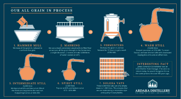 Fordi de bruger 'All Grains In'-processen, hvilket grundlæggende betyder, at kornene (tørvet maltet byg) knuses i hammermøllen, men skallerne og resterne ikke filtreres fra (som det gøres i en standardproces). Det betyder, at skallerne (som indeholder røgsmagen, fordi de har været i kontakt med tørveilden, da de blev tørret) forbliver i brygnings- og gæringsprocessen indtil den første (vask) destillationsapparat. Det betyder, at den spiritus, der ankommer til destillationsapparaterne, er intenst sød og røget. Det giver også en masse rengøring og ineffektivitet, men sådan blev whisky lavet i Donegal for 120 år siden (ifølge den opskrift, James arvede fra sin bedstefar).